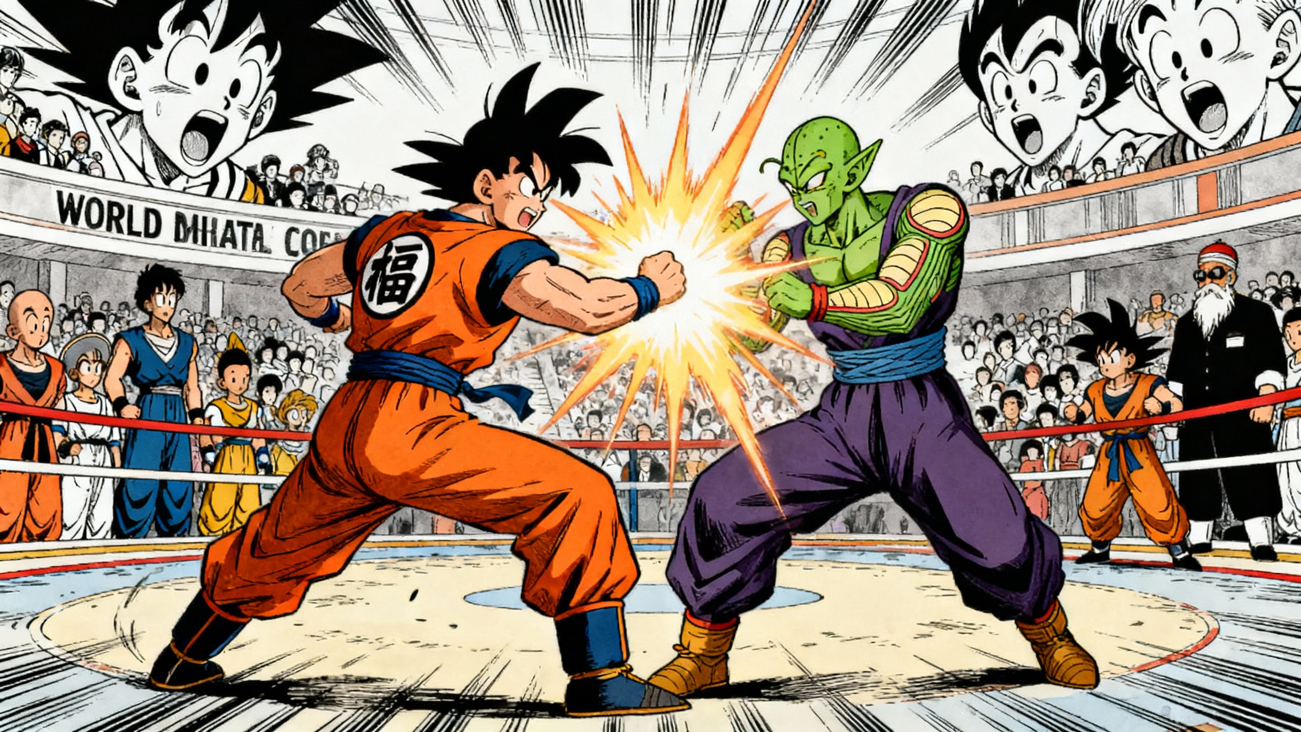 Dragon Ball manga style, World Martial Arts Tournament, Piccolo Daimao and Goku fighting, other characters with surprised expressions. Output images only, no text.