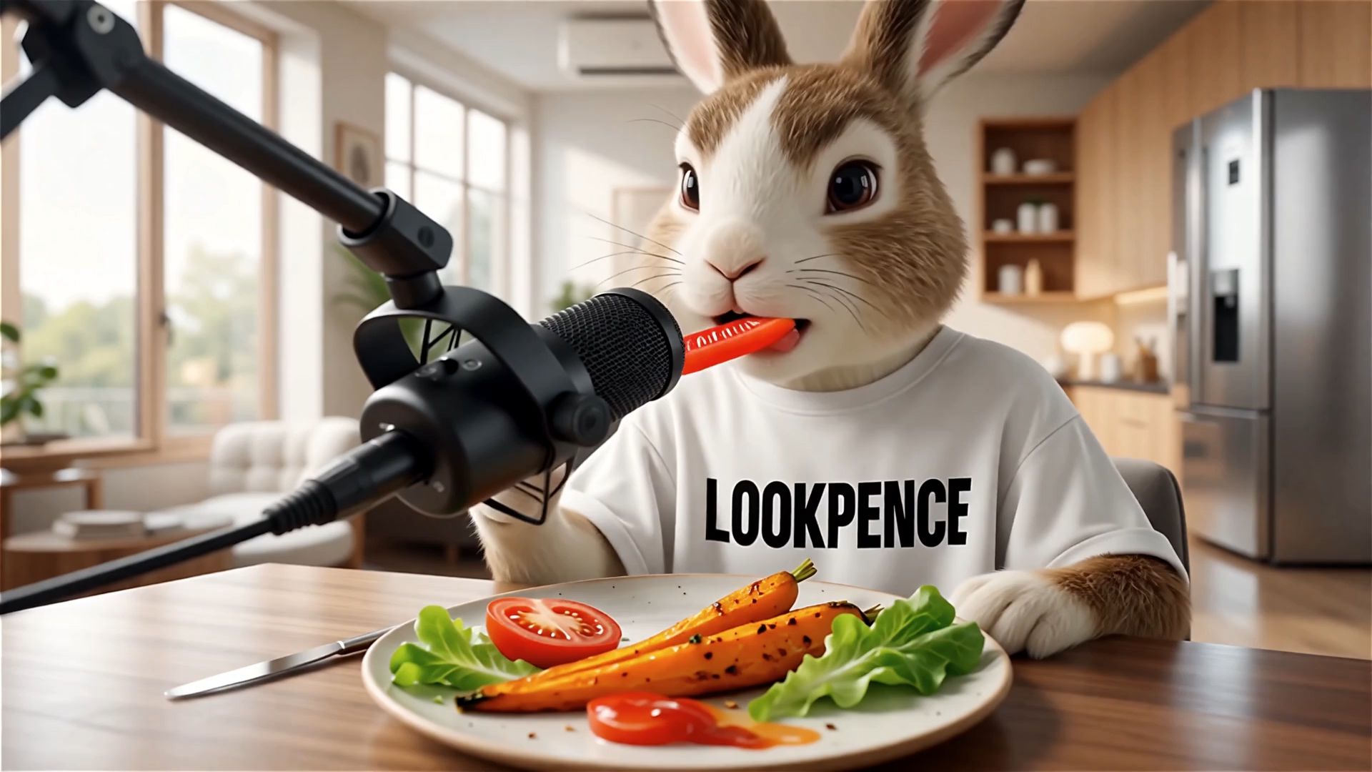 A hyper-realistic, human-like style ASMR food video blog with a resolution of 4K, frame rate of 24 frames per second, shallow depth of field, and soft, warm lighting. An anthropomorphic, highly realistic rabbit blogger (with soft white and brown fur, expressive eyes, wearing a white casual T-shirt with 'LOOKPENCE' printed on the chest) sits beside a wooden table in a cozy modern room, facing the camera as if he were a YouTube ASMR creator. On the table is a carefully arranged 'roasted carrot' dish - golden, crispy carrot pieces surrounded by fresh green leaf lettuce and sliced red tomatoes. A large black ASMR microphone is placed on a stand, close to the plate and the rabbit's mouth, clearly visible in the frame. There is no music. Focusing on the meticulous ASMR food chewing sounds: the gentle crunch of crispy roasted carrots, the soft bite of lettuce, the juicy bite of tomatoes, the subtle sounds of lips and mouth, the gentle clinking of plates and utensils, the quiet chewing sounds and swallowing sounds. At the same time, very soft environmental sound effects are added: faint ambient sounds, perhaps the humming of a distant air conditioner or refrigerator, with the volume kept low to allow the chewing sounds to dominate. The rabbit looks towards the camera, as if communicating with the audience (its mouth movements can be subtle, without clear speech), and then slowly and calmly takes a bite of the food directly beside the microphone. Using smooth, simple camera movements (slight handheld shooting effect), and shooting the rabbit's face, the microphone, and close-up shots of the food to highlight this realistic, calming experience..