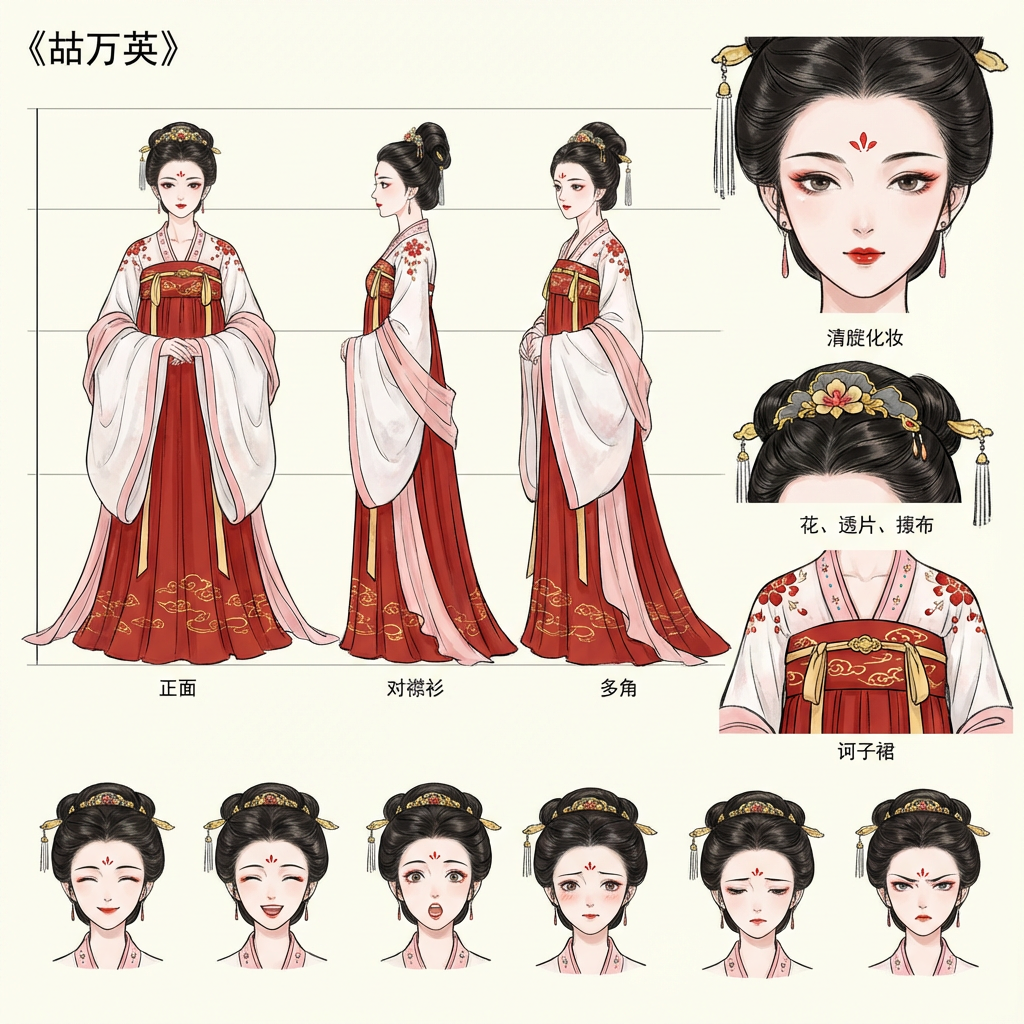 女主顾婉莹,审稿170,鸭蛋脸,大眼睛,平眉,小嘴,性格活泼,古风汉服风格的定妆造型,整体走典雅温婉的国风路线,细节精致且层次感丰富: