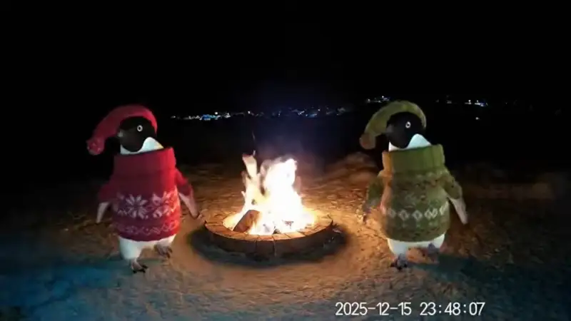 Two Adélie penguins dressed in subtle, cute Christmas outfits dance alone around a burning firepit.