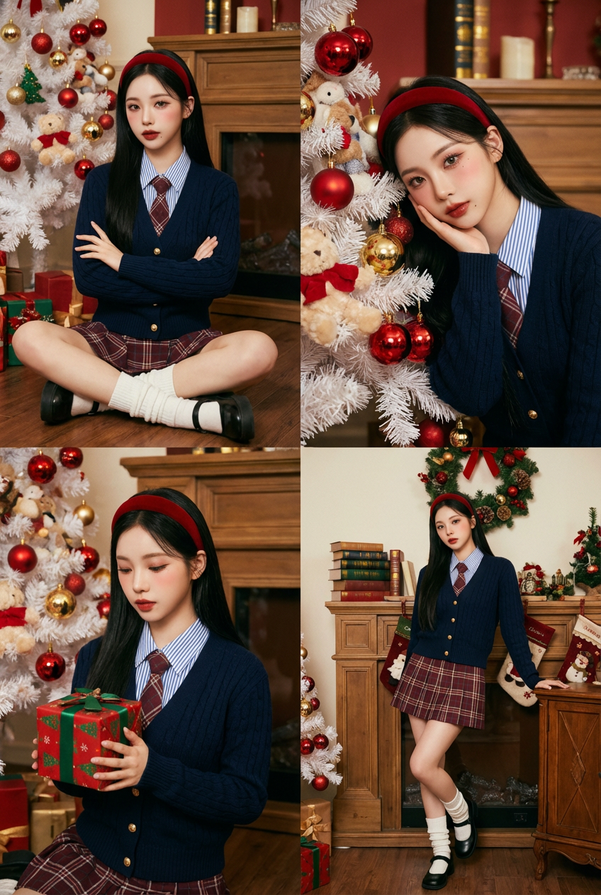 背景:圣诞主题场景——白色雪松圣诞树(装饰红金彩球+毛绒玩偶)、木质壁炉(旁放圣诞花环+堆叠书籍)、圣诞袜装饰。