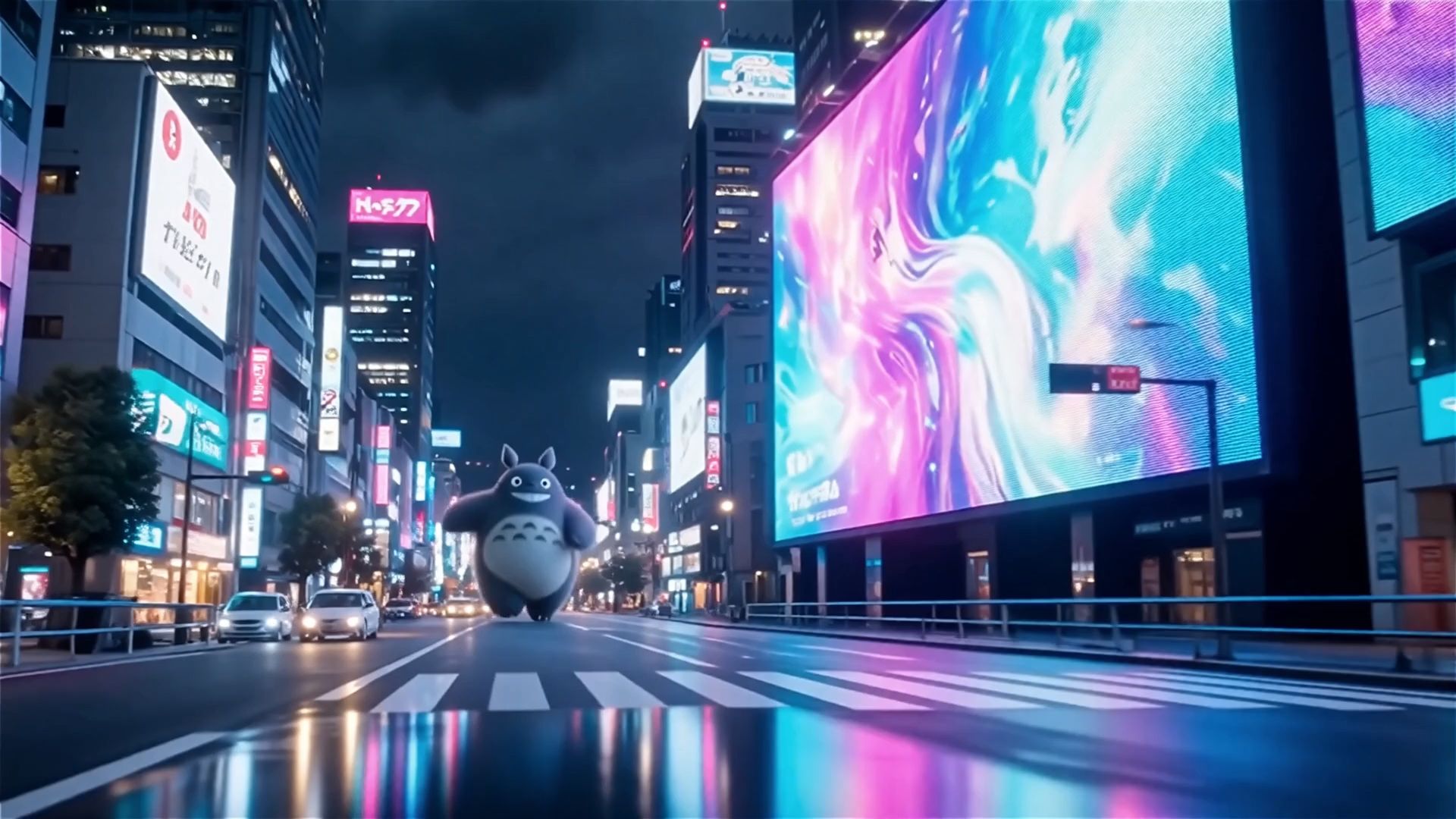 A cinematic odyssey through a reimagined modern Tokyo begins with a wide shot of a neon-lit boulevard where Totoro’s massive silhouette is framed against a giant digital billboard. In a medium tracking shot, Totoro begins to sprint down the center of the street, his massive paws creating booming, rhythmic echoes that drown out the sound of traffic. The lighting transitions from cool urban blues to a warm, golden aura emanating from his fur. As he reaches a central plaza, the camera captures him in a wide shot as he lets out a deafening, joyful roar that magically transforms the surrounding streetlights into thousands of floating soot sprites that swirl around the buildings. Suddenly, the Catbus arrives in a blur of hyper-kinetic motion, its many paws thumping against the pavement with chaotic, playful energy. The final shot is a dramatic wide-angle view of Totoro leaping onto the roof of the Catbus as it takes flight, soaring between skyscrapers into the clouds. The audio is a rich tapestry of deep roars, the "meow" of the Catbus horn, the fluttering of soot sprites, and a heart-thumping, cinematic orchestral climax.
