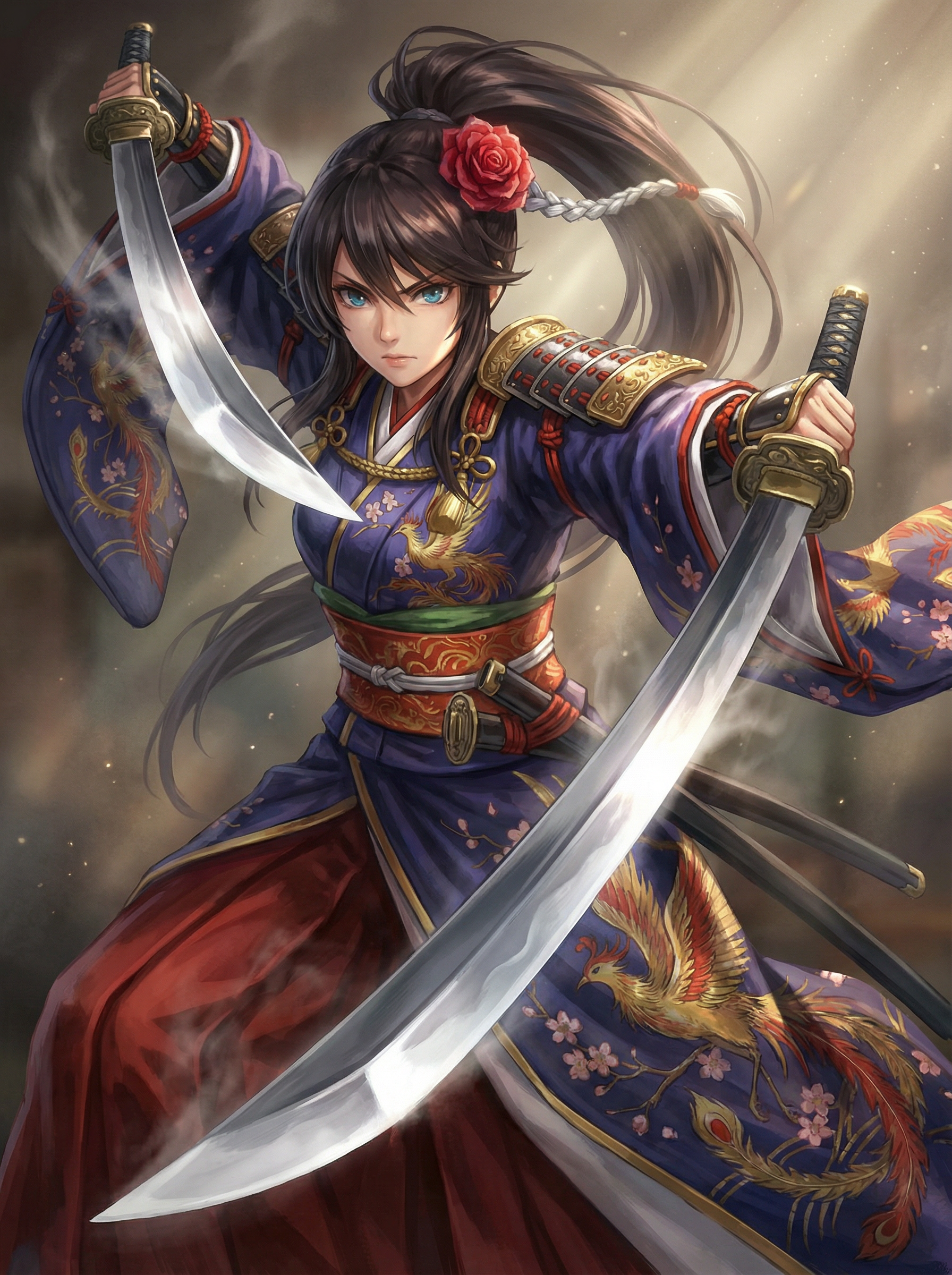 大师之作,最佳品质,超精细细节。数字绘画。半写实风格,《信长之野望:新生》人物立绘风格,光荣特库摩官方美术风格,厚重的笔触,细腻的纹理。高分辨率。动态姿势,双手举刀,武士刀迎面劈向观众,强烈的镜头透视感,刀尖直指镜头,电影感灯光,戏剧性阴影,体积光,景深
