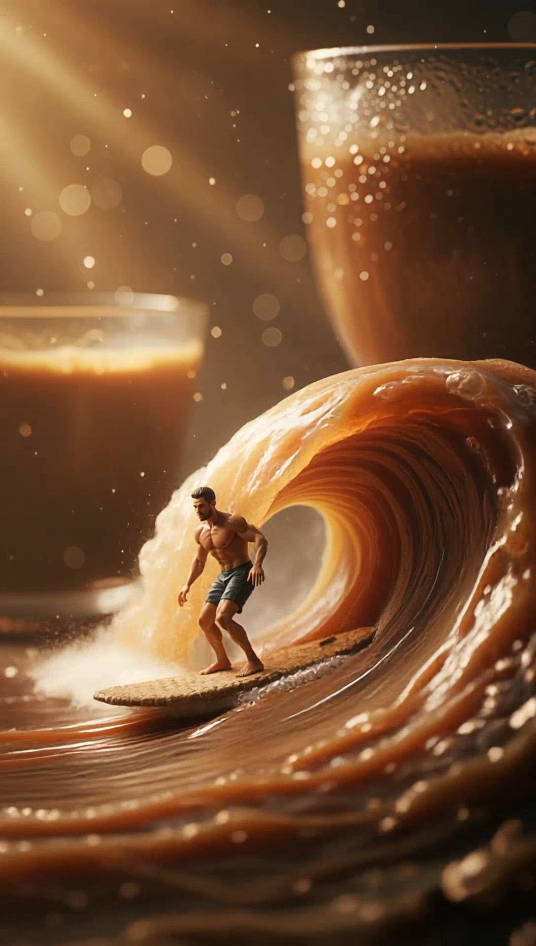 Rich coffee liquid turbulently swirls forming waves, a muscular man surfs on a straw surfboard in mid-air. Foam wave crests have semi-transparent amber quality. Blurred coffee cup edge with condensation droplets in background. 8K ultra-clear display of coffee cup's refracted light spots. Macro-capture of foam bursting crystal moment. Motion blur processing of splashing liquid trajectories. Coffee liquid with glossy appearance under backlight. Surfboard leaves silky wake lines, with depth-of-field blur of rising bubbles behind. Warm light source contrasts with cool foam. Tyndall light beams penetrate coffee liquid creating divine feeling. Hyper-realistic liquid simulation technology with miniature world fantastic visual impact.