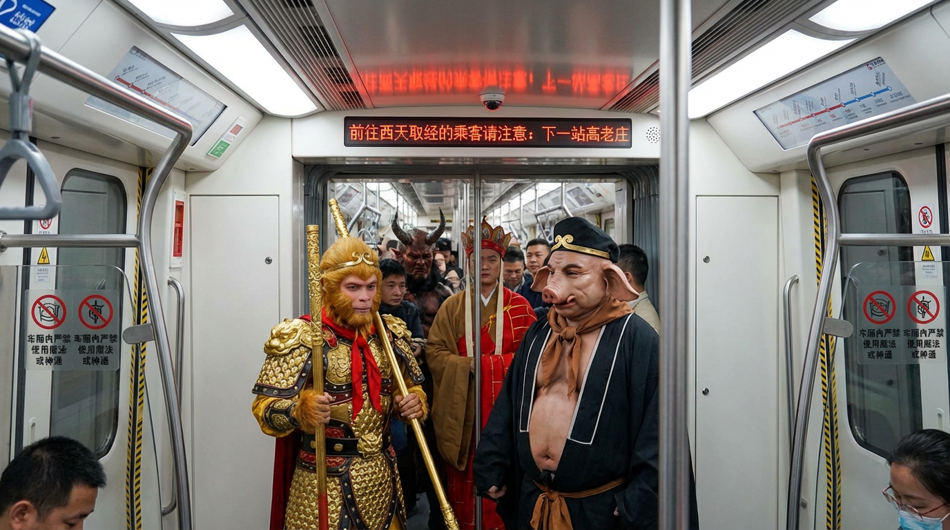 Crowded Beijing subway car interior with passengers who are all mythological characters including Sun Wukong (Monkey King), Zhu Bajie (Pig), and other legendary figures from Journey to the West. At the car connection area, there is a rolling LED display showing red text that reads 'Passengers bound for the Western Paradise, please note: Next stop is Gao Village'. On the train door glass, there are warning signs posted that say 'No magic or supernatural powers allowed in the car'.