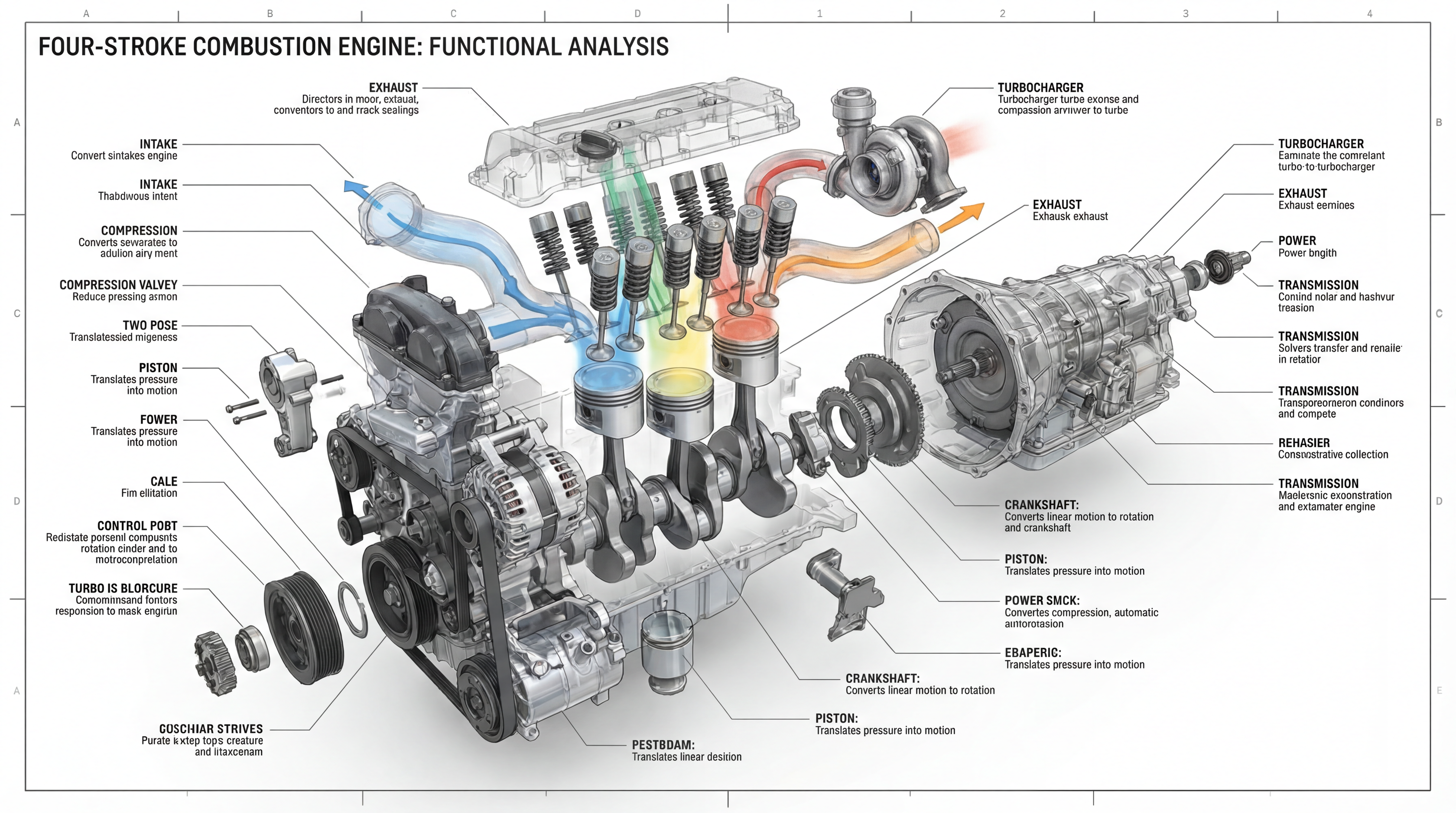 A highly detailed 3D cutaway technical diagram of a car engine showing its working principles, with internal structure precisely rendered. Each component is disassembled and arranged in an orderly manner, with clear English labels indicating structural names and functional descriptions. The overall layout combines professionalism with visual logic, presenting a clear, neat and highly technological analytical diagram.