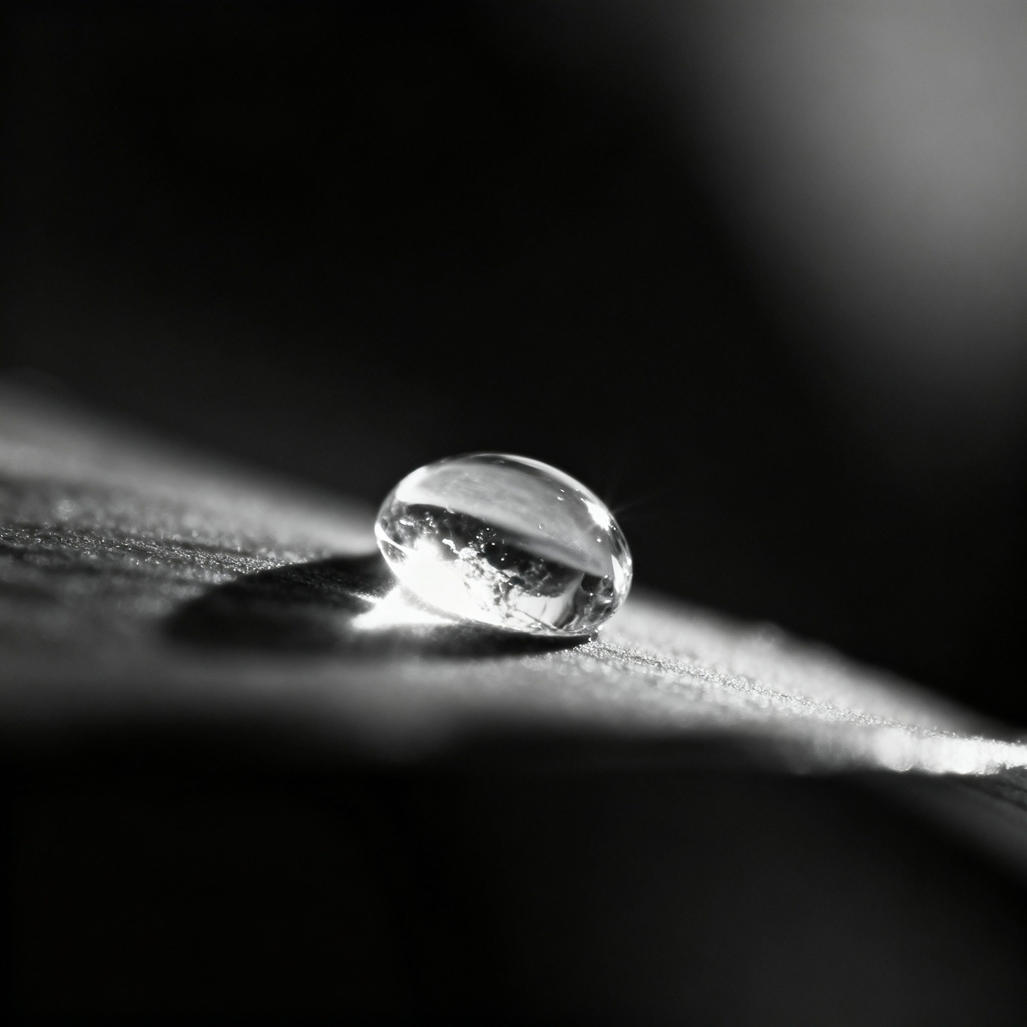 A single small crystal-clear water droplet against a simple dark background, artistic representation with translucent and bright water droplet showing texture and light effects