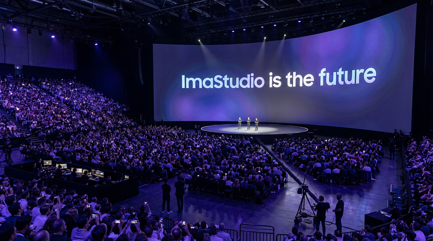 A grand Apple-style product launch event venue with many audiences, dark scene with brilliant lighting, camera focused on a wide curved screen with perspective, the screen displays 'ImaStudio is the future' text, small silhouettes of people standing on stage, purple to blue gradient diffused background, white text with some gradient effects, looks like live photography with premium quality