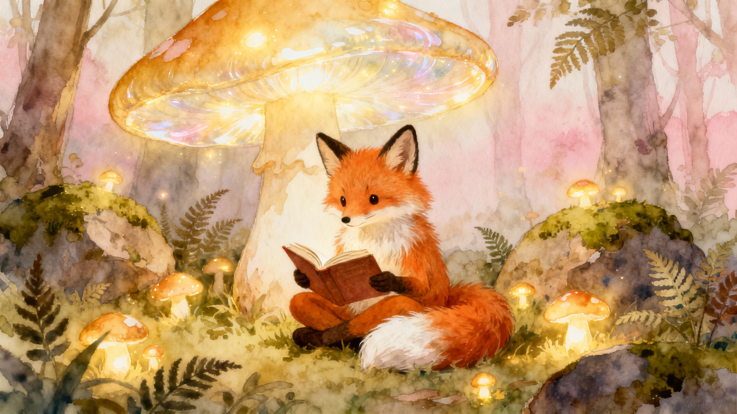A cozy little fox reading a book under a glowing mushroom in a magical forest with soft lighting and watercolor illustration style. Output images only, no text.
