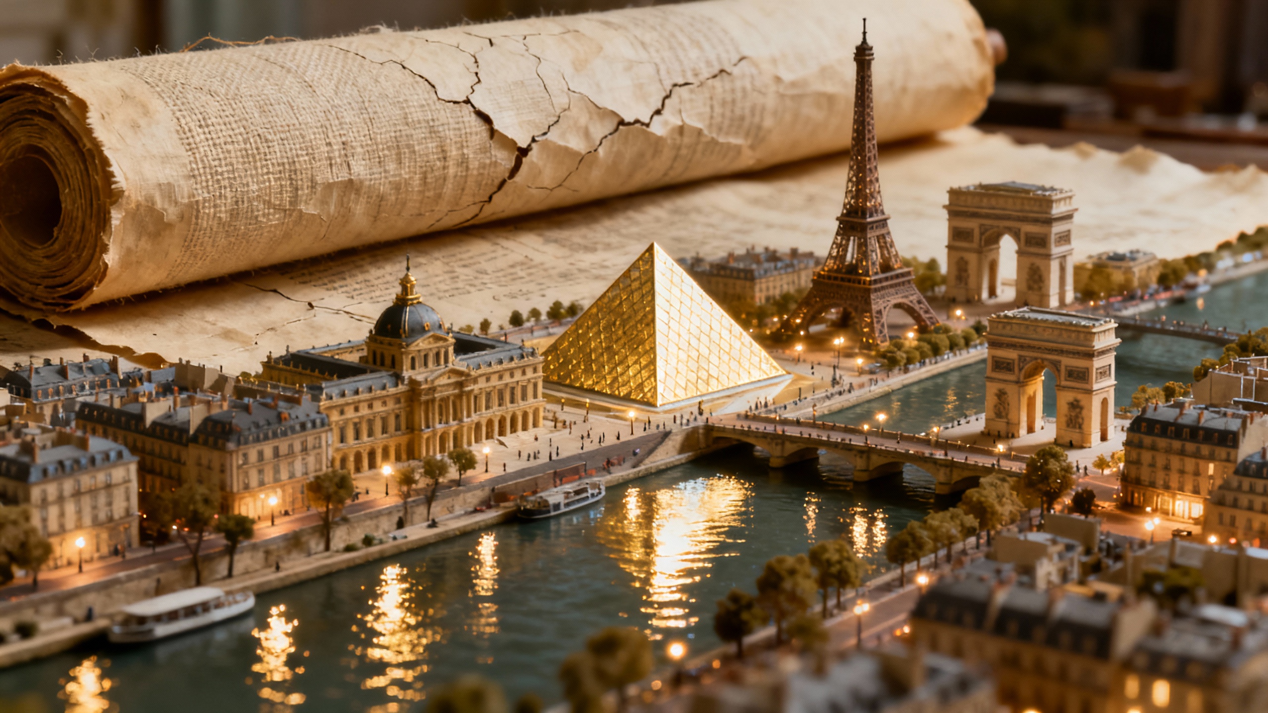 8K高清,复古画布纸卷轴质地,纸面细微裂纹与柔金反光。微缩巴黎城市群逐渐浮现:埃菲尔铁塔、卢浮宫金字塔、塞纳河两岸、凯旋门。灯光真实反射,玻璃与金属材质具摄影级物理光感,画面柔和雅致。