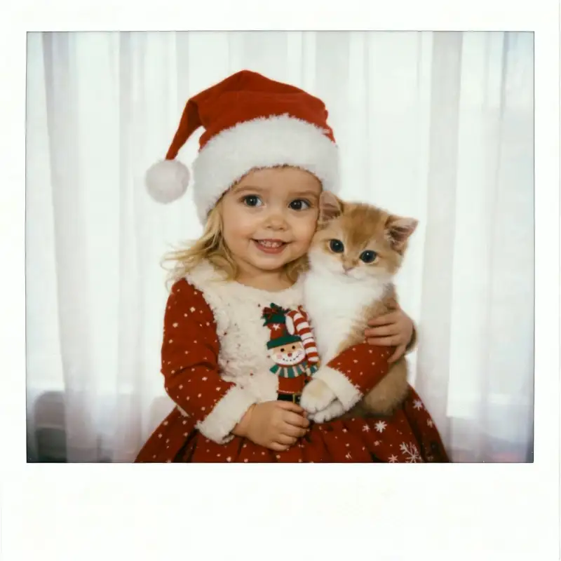 一名儿童温柔地抱着猫咪,画面呈宝丽来相机风格,轻微模糊感,背景是白色窗帘。光线柔和均匀,如同暗室闪光灯效果。儿童和猫咪有轻微的呼吸动作,猫咪尾巴微微摆动,窗帘随微风轻轻飘动,整体画面保持温馨自然的氛围。